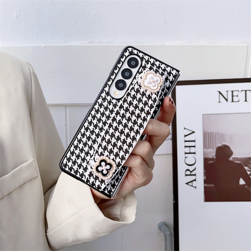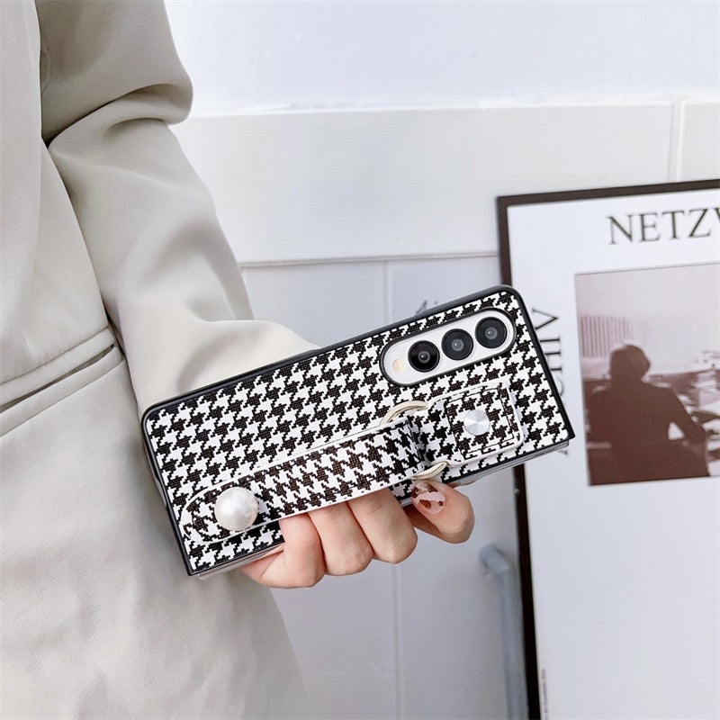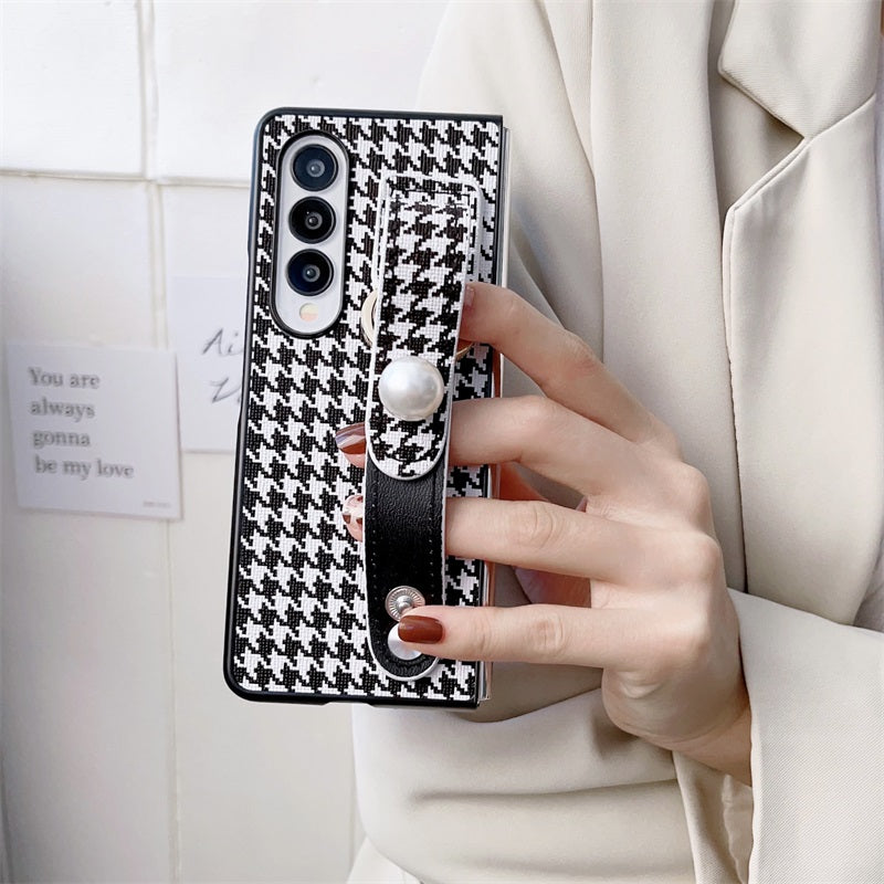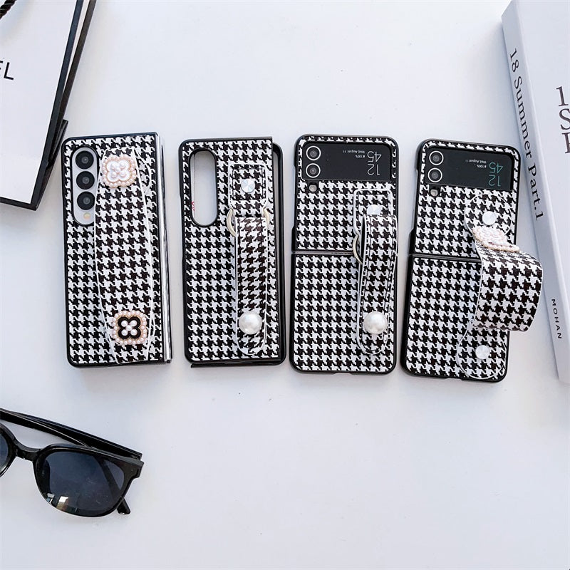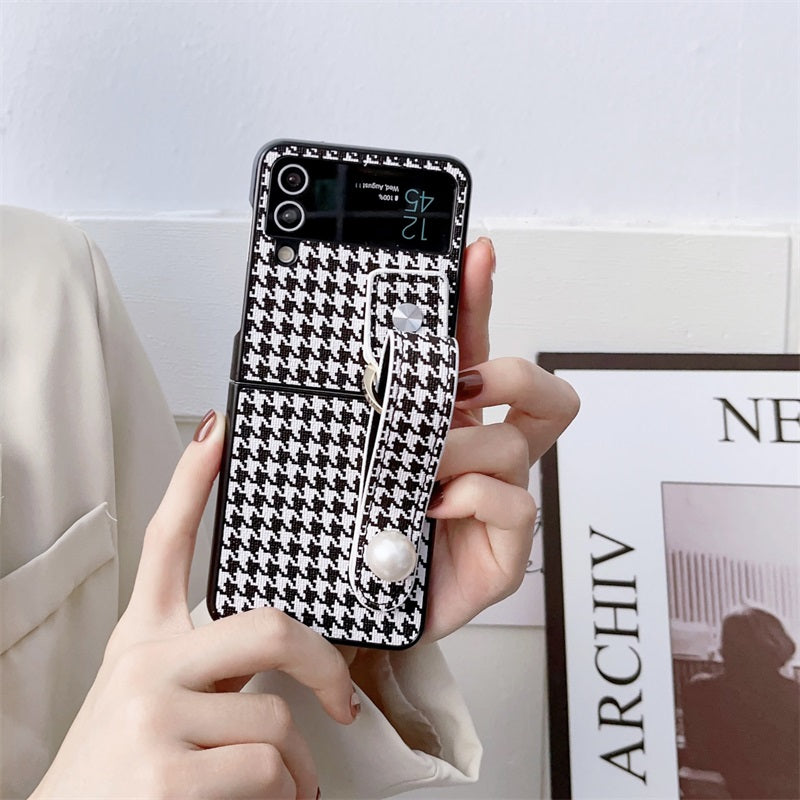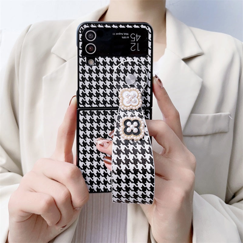 Luxury Style Houndstooth Leather Phone Cover With Pearl wristband Strap Tpu Pc Leather 2 In 1 For Samsung Zflip3 4